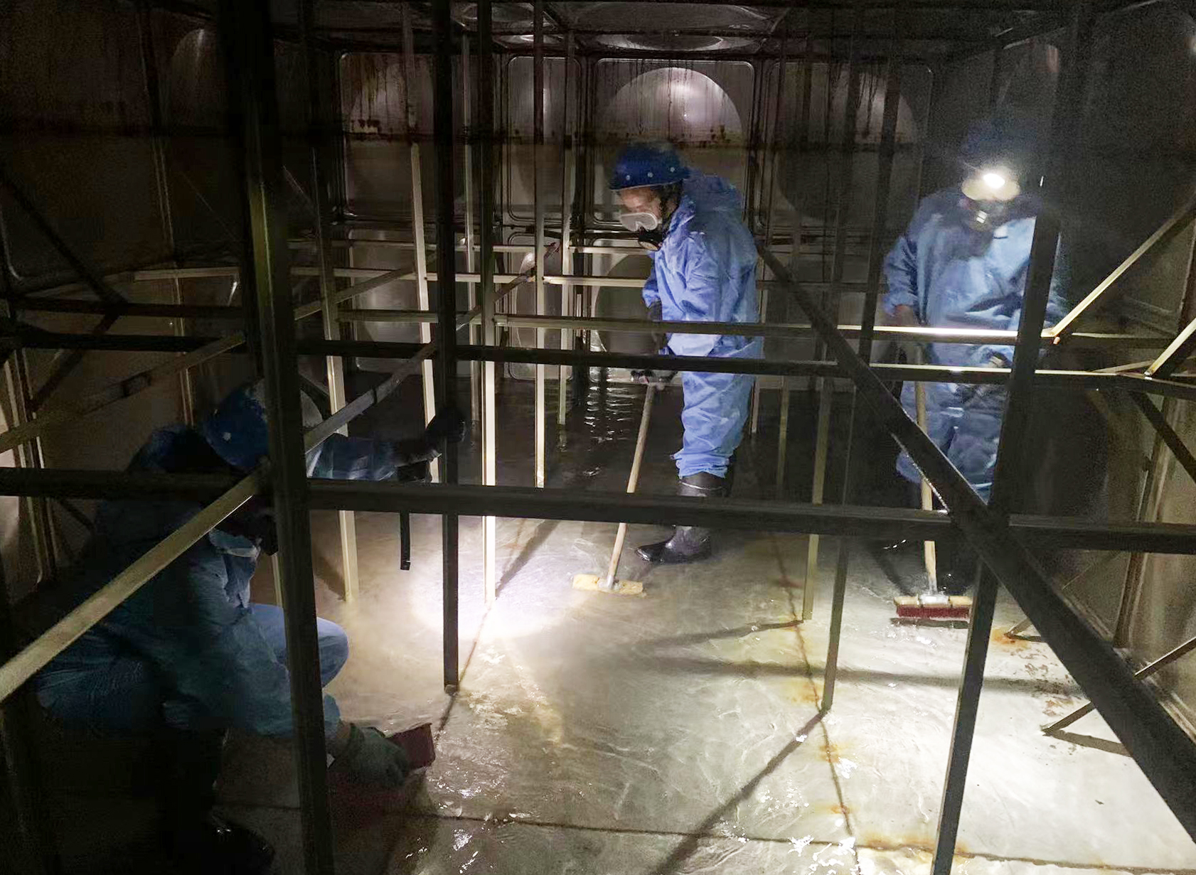 圖:泵房設(shè)備檢修現(xiàn)場 很多人認為日常巡檢就是“走一圈”,殊不知,這看似簡單的工作背后,藏著供水人的別樣匠心,供水“鏈條”環(huán)環(huán)相扣,日常巡檢便是其中重要一環(huán)。一次氣管漏氣被漏檢,可能引起隔膜泵運行不穩(wěn)定;一處隱患點被遺漏,可能導(dǎo)致設(shè)備停運;一組濕度數(shù)據(jù)被忽視,可能造成設(shè)備被濕度過高的空氣銹蝕……類似這樣的巡檢細節(jié)不勝枚舉,因此,著眼于細節(jié)是巡檢員們必備的品質(zhì),及時發(fā)現(xiàn)、分析、解決問題,讓每一臺設(shè)備處于良好的運行狀態(tài),便是維修人員最大的底氣。 錯峰作業(yè),密切配合保水質(zhì) 清水池是水廠成品水的儲存水箱,承擔著調(diào)蓄、穩(wěn)壓、消毒的重要作用,能夠?qū)崿F(xiàn)“高峰多送,低峰多貯”的調(diào)節(jié)功能,因此清水池的“健康”與供水水質(zhì)密切相關(guān)。按前期規(guī)劃部署,公司利用五一假期完成了三棵樹增壓泵站清水池維護清洗任務(wù)。為順利完成清洗任務(wù),制水部、機電設(shè)備部、調(diào)度中心在前期共同制定施工方案,明確各自任務(wù)。清洗現(xiàn)場,制水部與機電設(shè)備部密切配合,清洗過程井然有序,三棵樹增壓泵站清水池維護清洗任務(wù)順利完成為洋河新區(qū)及周邊鄉(xiāng)鎮(zhèn)供水安全提供了堅實的保障。 當夜幕降臨,城市沉靜下來,居民用水量變小之時,正是供水人執(zhí)行特定作業(yè)任務(wù)的最好時機。當面對泵房只有一個水箱進行供水時,水箱清洗員就需要在深夜時進行清洗作業(yè),待排水、通風換氣、清洗、消毒等一系列工作全部完成,水箱清洗員也將迎來黎明前的第一縷陽光。在清水河至蘇州路路段,建管中心、管網(wǎng)部、制水部等幾個部門經(jīng)過十幾天通宵達旦的緊張施工,終于完成了該路段供水管道沖洗工作……