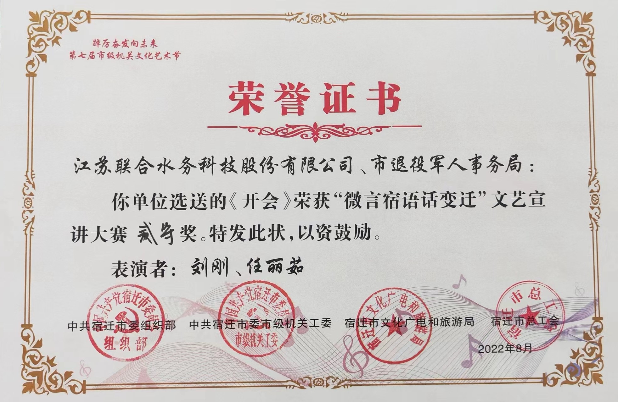 近日,一場精彩的文藝宣講大賽在宿遷市文化館的小劇場拉開了帷幕,由宿遷市委組織部、市級機(jī)關(guān)工委、文化和廣電旅游局和市總工會主辦的第七屆市級機(jī)關(guān)文化節(jié)在這里隆重舉行,共23個單位28個節(jié)目300多位演員在這里緊張角逐,最終江蘇聯(lián)合水務(wù)科技股份公司宿遷供水公司精心打造的節(jié)目——快板書《開會》奪得比賽二等獎。