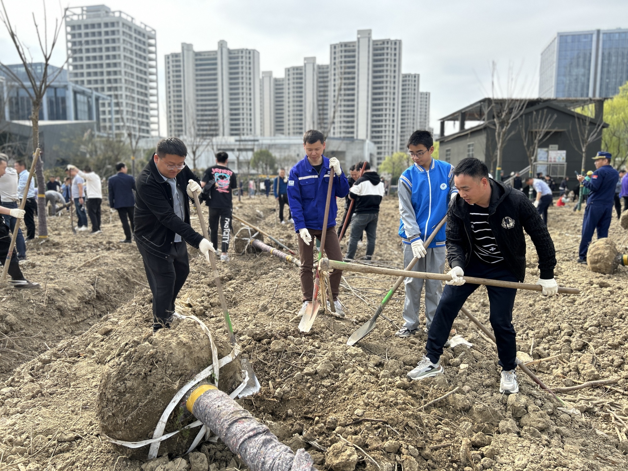 在植樹現(xiàn)場,公司志愿者們按事先分工,揮鍬鏟土、扶苗培土、拎桶澆水……所有人分工協(xié)作、配合默契,現(xiàn)場呈現(xiàn)出一派熱火朝天的勞動景象。經(jīng)過現(xiàn)場全體人員的辛勤努力,300余株櫸樹苗木迎風(fēng)挺立,為區(qū)街增添綠意和生機(jī)。