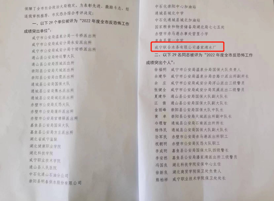 近日,咸寧市反恐怖工作領(lǐng)導(dǎo)小組辦公室發(fā)布了《關(guān)于表彰2022年度全市反恐怖工作成績(jī)突出單位和個(gè)人的決定》,咸寧聯(lián)合水務(wù)有限公司潘灣水廠榮獲“2022年度全市反恐怖工作成績(jī)突出單位”稱號(hào)。
