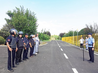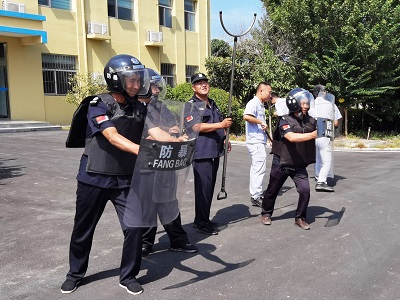 一番短暫練習(xí)之后,模擬演練正式開(kāi)始。本次演練模擬的是1名暴徒持兇器欲強(qiáng)行進(jìn)入廠區(qū)圖謀不軌,安保人員發(fā)現(xiàn)后立即上報(bào),并手持鋼叉、防暴盾等工具與“暴徒”展開(kāi)周旋阻止其進(jìn)入,公司立即啟動(dòng)反恐應(yīng)急預(yù)案,第一時(shí)間向上級(jí)公安機(jī)關(guān)報(bào)警,并迅速組織公司安保人員及在廠員工共同與“可疑人員”抵抗。派出所民警在接到報(bào)警后立即出警,和公司人員一起將“可疑人員”控制并帶走。