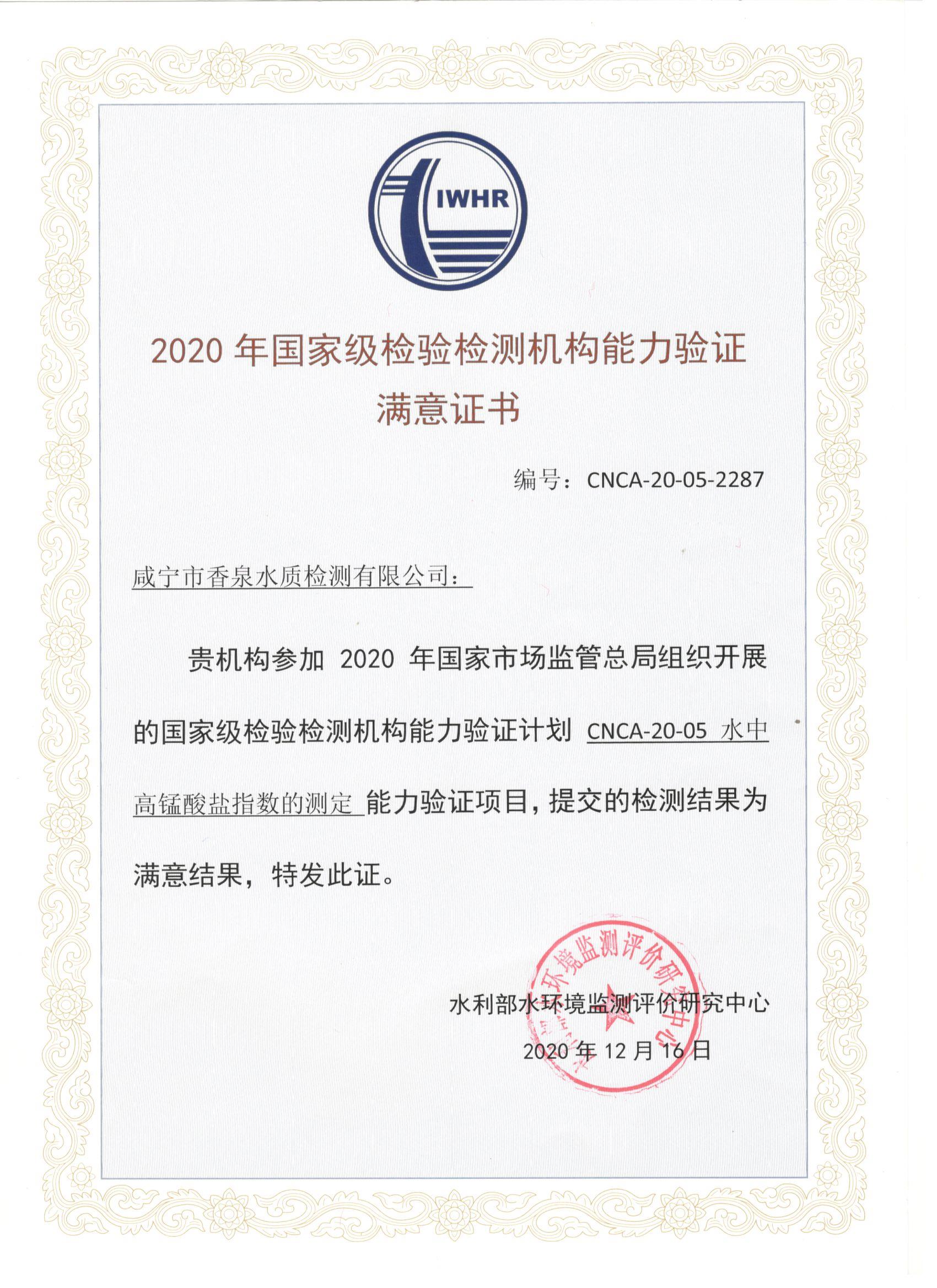咸寧市香泉水質(zhì)檢測有限公司為江蘇聯(lián)合水務(wù)科技股份有限公司(股票代碼:603291.SH)的全資子公司,成立于2018年6月,公司于2019年1月通過省級檢驗檢測機構(gòu)CMA資質(zhì)認(rèn)定,同年被湖北省住建廳審核確認(rèn)為湖北省城市供水水質(zhì)監(jiān)測網(wǎng)咸寧監(jiān)測站,現(xiàn)具有生活飲用水、地表水及水處理劑等三類產(chǎn)品106個項目的檢測資質(zhì),檢測能力處于湖北省同行業(yè)較為先進水平,是咸寧市生活飲用水檢測領(lǐng)域資質(zhì)最全的專業(yè)檢測機構(gòu)之一。據(jù)統(tǒng)計,聯(lián)合水務(wù)香泉水檢公司自成立以來,先后參加國家級或省級質(zhì)控考核和能力驗證8項次,結(jié)果合格(滿意)率達(dá)到100%。