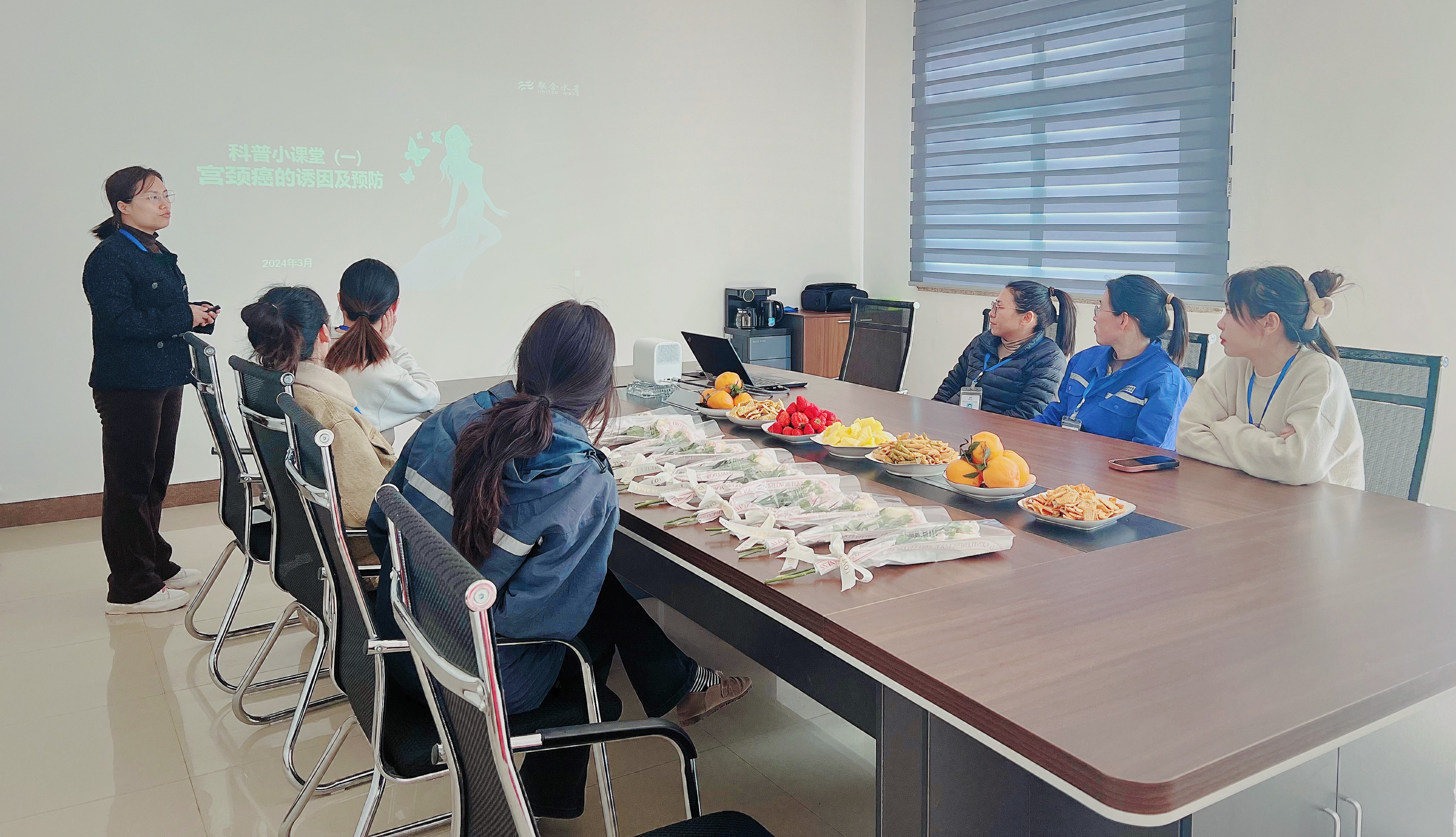 人間最美三月天,春花爛漫展新顏。為積極營(yíng)造和諧、溫馨、健康的節(jié)日氛圍,聚焦女性正能量、幸福獲得感,3月7日,在第114個(gè)“三八”國(guó)際勞動(dòng)?jì)D女節(jié)來(lái)臨之際,曲沃聯(lián)合凈水有限公司組織全體女職工開(kāi)展了——致敬“她”力量,健康普惠澤的主題活動(dòng)。 一、致敬“她”力量 本次活動(dòng),以茶話會(huì)的輕松愉悅形式開(kāi)展,向女士們表達(dá)節(jié)日祝福,致敬“她”力量。 同時(shí)為“女神們”準(zhǔn)備了大家喜好的水果、零食,大家互訴衷腸、嘮家常......相互分享禮讓互敬的氛圍,是聯(lián)合水務(wù)女性職工柔性、團(tuán)結(jié)的最好展現(xiàn)。 二、健康普惠澤 本次茶話會(huì)的同時(shí),也以“科普小課堂”的形式,分享宮頸癌的誘因及預(yù)防措施,旨在科普相關(guān)病毒的基本常識(shí)、預(yù)防措施、干預(yù)手段等,防患于未然,健康雙重保險(xiǎn)。