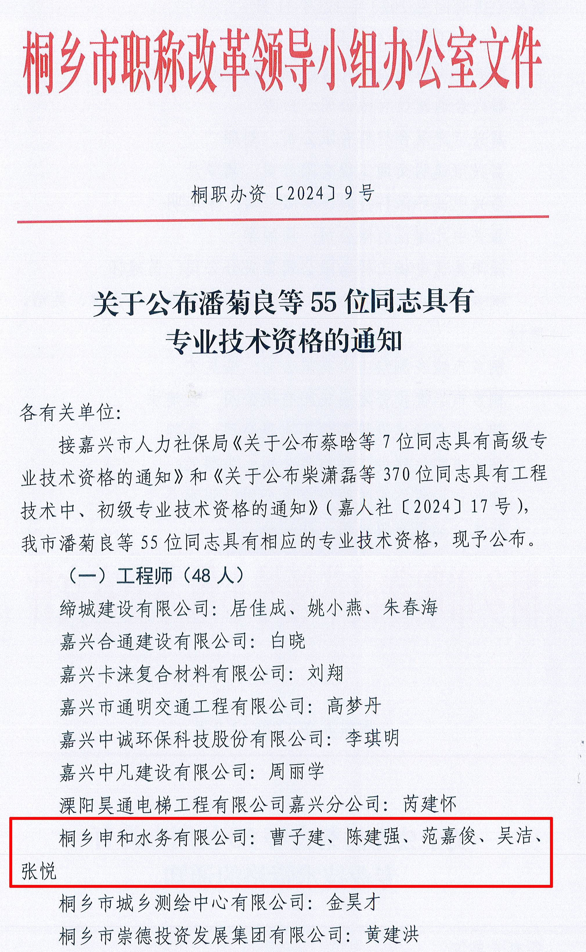近日,桐鄉(xiāng)申和水務(wù)有限公司曹子建、陳建強、范嘉俊、吳潔、張悅5名員工一同順利通過嘉興市工程技術(shù)中級專業(yè)技術(shù)資格評審委員會評審及認定,成功獲得生態(tài)環(huán)境監(jiān)測與分析專業(yè)中級工程師職稱。