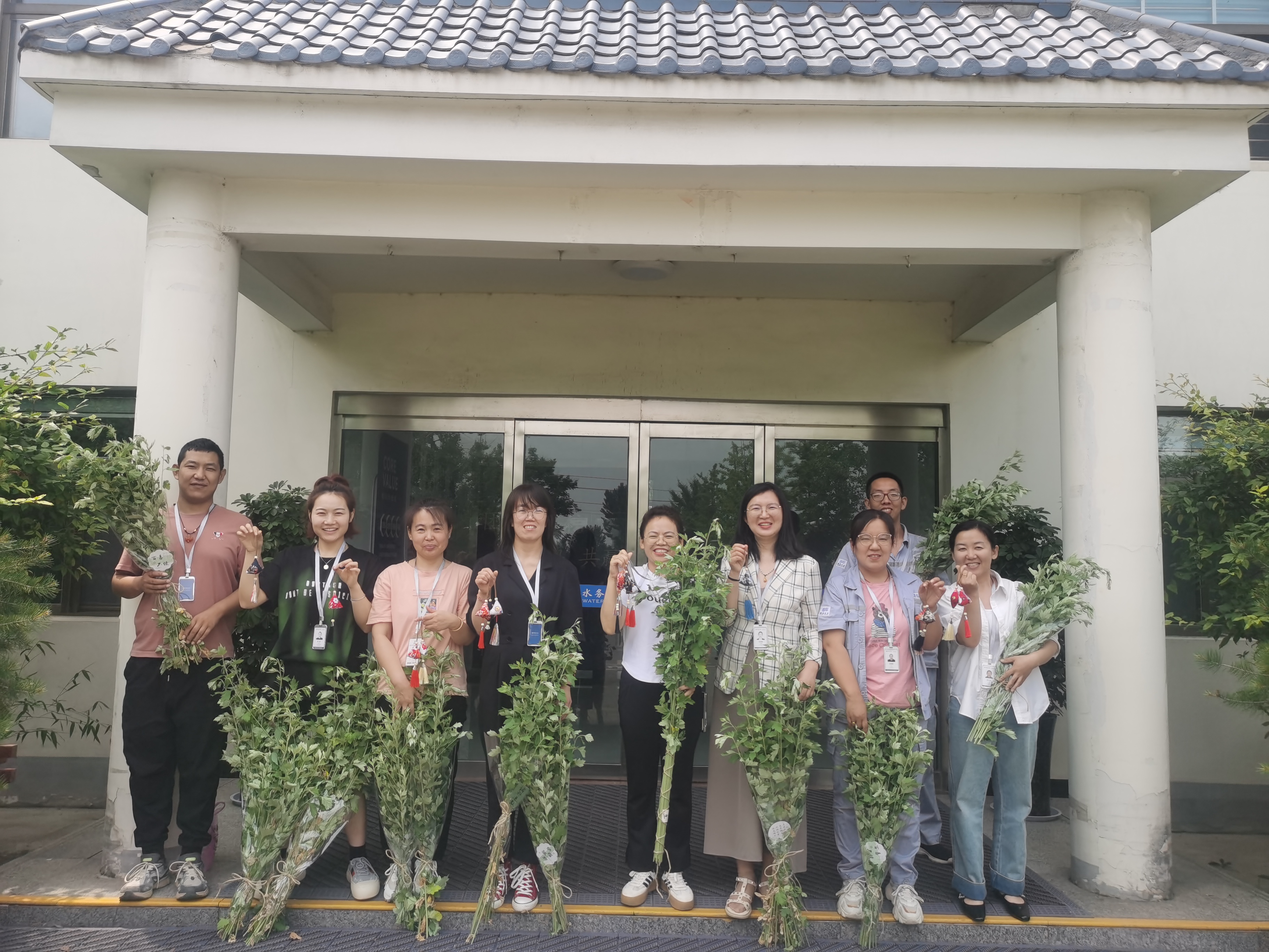 艾草花束 沒有一個(gè)節(jié)日的儀式感是一束花所給不了的,端午節(jié)也不例外。此次活動(dòng)大家就地取材,公司員工提前挖出園里的新鮮艾草、用剪刀修剪艾草的長(zhǎng)度和形狀,制造層次感。并將包裝紙裹在艾草根部,用麻繩固定。在花束上綁上各式的小卡片或小裝飾品。一束束飽含吉祥象征的端午花束就做好了。制作現(xiàn)場(chǎng)大家互幫互助互敬互贈(zèng),彼此將美好的祝福及心意連同花束一同贈(zèng)予。倒掛的艾草花束,傳遞出的是納福驅(qū)邪,祝福安康的美好寓意,也是團(tuán)隊(duì)協(xié)作之美的彰顯。