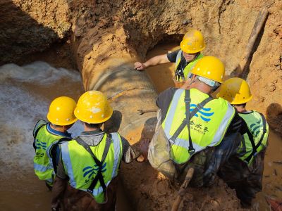 不懼“烤”驗(yàn),隨時(shí)出擊。7月5日,永安大道DN600主管道突發(fā)爆管,咸寧思源水務(wù)接到報(bào)修電話,立即組織人員趕赴現(xiàn)場(chǎng),爭(zhēng)分奪秒開(kāi)展管網(wǎng)搶修作業(yè)。搶修人員第一時(shí)間設(shè)置安全警示標(biāo)識(shí),在確定好漏點(diǎn)位置、做好現(xiàn)場(chǎng)保護(hù)、關(guān)閥停水后,頂著36℃高溫,有條不紊展開(kāi)搶修工作。經(jīng)過(guò)抽水、挖掘、清理,管道破損位置露出水面。在狹長(zhǎng)窄小的管溝中作業(yè),轉(zhuǎn)身接零部件都得小心翼翼,搶修人員身上的衣服濕了干、干了濕,似火的烈日曬得他們皮膚滾燙,藿香正氣水的刺鼻味道充斥在他們的胸腔,有人笑稱(chēng):“藿香正氣水都喝飽了!蹦呐略谶@樣的工作環(huán)境下,他們也沒(méi)有一個(gè)人抱怨,沒(méi)有一個(gè)人偷懶,用八多個(gè)小時(shí)的堅(jiān)守?fù)Q來(lái)了居民在炎炎夏日里的用水安全。