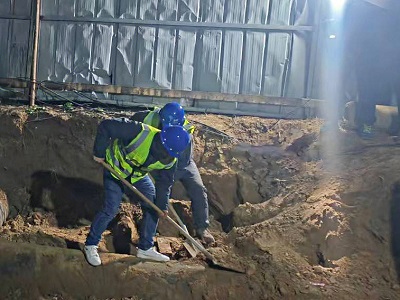 “迅速啟動夜間應(yīng)急響應(yīng)” 近日,皂河、黃墩、王官集三個鄉(xiāng)鎮(zhèn)DN500供水主管網(wǎng)壓力異常,情況緊急,公司迅速啟動夜間應(yīng)急響應(yīng)機制,由管網(wǎng)部總監(jiān)劉朗牽頭,帶隊支援皂河區(qū)域供水服務(wù)中心,一支由20余人組成的聯(lián)合巡線搶修隊快速集結(jié),在深夜展開了一場與時間賽跑的搶修戰(zhàn)。凌晨00:30,搶修隊在一處施工場地圍擋內(nèi)發(fā)現(xiàn)了漏點,漏點較為隱蔽,且漏水量大。為盡可能縮短停水時間、減少水量損失,搶修人員迅速制定了維修方案,采用同步作業(yè)模式,機械開挖與人工清淤交替進(jìn)行,確保作業(yè)高效推進(jìn)。從發(fā)現(xiàn)漏點到完成受損管段維修,僅用4個小時。凌晨04:30,供水系統(tǒng)全面恢復(fù),高峰期用戶的正常用水得到有力保障。