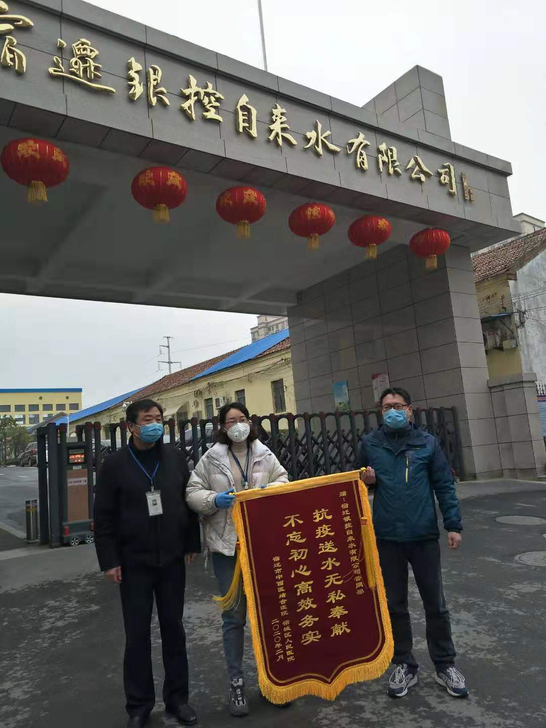真情總能沖散疫情的陰霾,溫暖人間。2月11日下午,晴空萬里,暖陽高照,公司門口來了幾位特殊的訪客,他們手捧錦旗,錦旗上“抗疫送水無私奉獻(xiàn)、不忘初心高效務(wù)實”十六個燙金大字閃閃發(fā)光。送錦旗的正是宿城區(qū)人民醫(yī)院的工作人員,他們十分感謝公司迅速為其疫情防控隔離點安裝了自來水,為疫情防控工作的順利開展提供了強(qiáng)有力的保障。