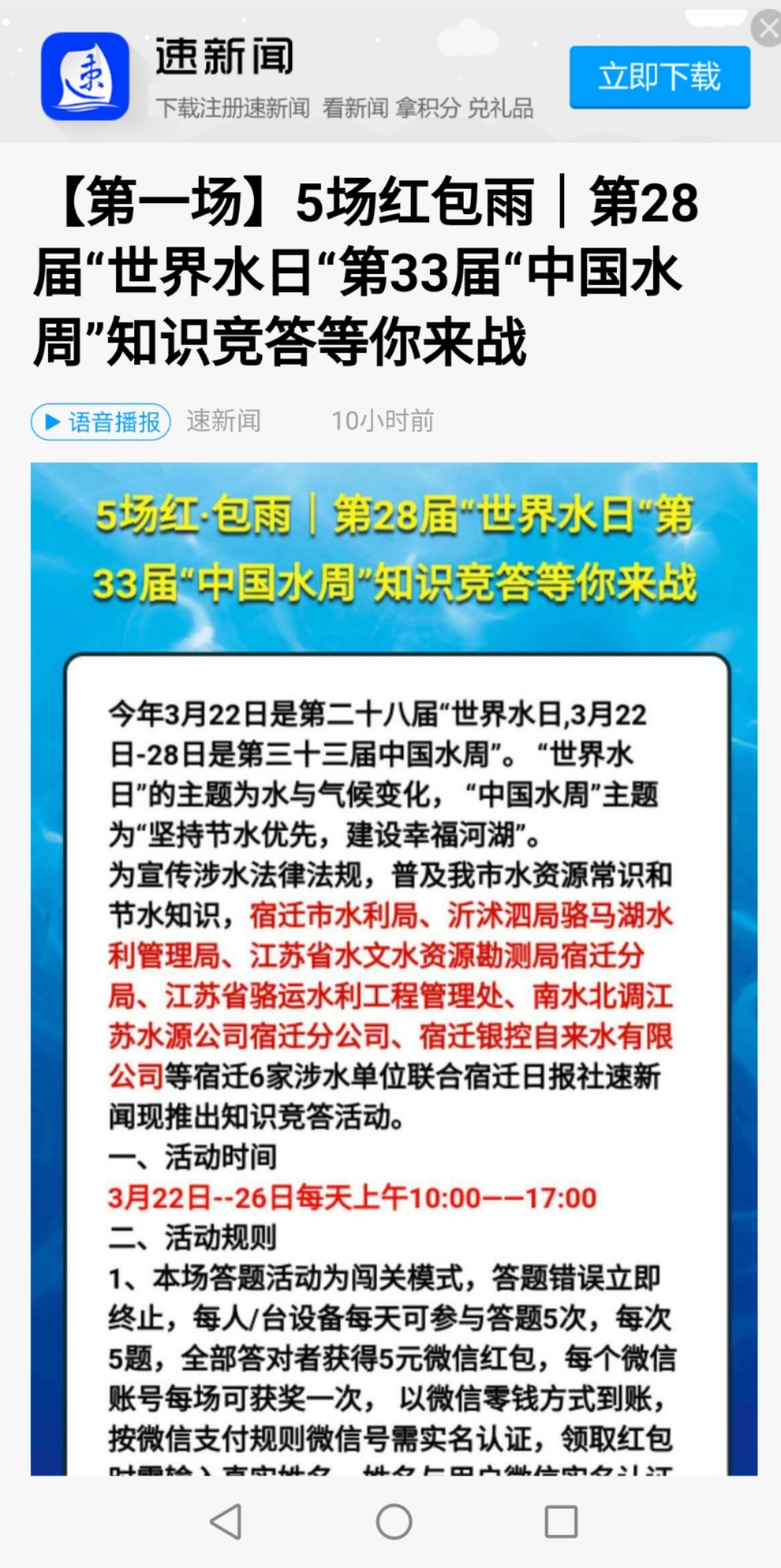 “汴水流,泗水流,流到瓜州古渡頭”。位于蘇北泗水畔的酒都宿遷以洋河美酒聞名大江南北乃至全世界。水是酒的命脈,好酒必有好水。宿遷,別稱“水城”,地處淮河、沂沭泗流域中下游,南臨洪澤湖,北接駱馬湖,著名的京杭大運河穿境而過。在3月22日“世界水日“、3月22日—28日 “中國水周”到來之機,聯(lián)合水務宿遷銀控自來水有限公司會同宿遷市水利局、沂沭泗局駱馬湖水利管理局、江蘇省水文水資源勘測局宿遷分局、南水北調江蘇水源公司宿遷分公司及宿遷日報社共同舉辦系列宣傳活動,護衛(wèi)城市命脈,傳承生態(tài)愿景。一方水土養(yǎng)一方人, 節(jié)水、護水、愛水,全員行動起來,讓水韻宿遷更加大放光彩。 受疫情影響,今年宿遷市的“世界水日”、“中國水周”宣傳活動采用線上方式扎實開展,方式新穎且力度不減。經(jīng)過前期合辦單位的用心籌劃,圍繞今年國家水利部確定的“堅持節(jié)水優(yōu)先 建設幸福河湖”的宣傳主題,系列宣傳活動以別開生面、匠心獨具的六大方式精彩呈現(xiàn),提高全市人民節(jié)水、護水、愛水意識,形成全員參與、共創(chuàng)水生態(tài)美好家園的良好氛圍。 全民總動員開始啦!網(wǎng)絡倡議書簽名轉發(fā)活動,倡議書內容豐富,既有宿遷市水資源知識,還有節(jié)水小竅門呢,以百姓喜聞樂見的微信群、通過微信群、微信朋友圈方式進行轉發(fā);網(wǎng)絡答題贏紅包活動,5場“紅包雨”,第28屆“世界水日”、第33屆“中國水周”知識全民競技,寓教于樂;意見建議征集活動,保護水資源,你獻計,他獻策,水更清、城更美,民更樂;網(wǎng)上攝影展活動,用鏡頭拍下最美水景,感受水鄉(xiāng)靈韻;水美文章征文活動,分享《童年的河》,一水一情,讓故鄉(xiāng)的水在心間流淌;彩印卡片+鮮花贈送活動,水法宣傳不見面,投放在銀行、商場、醫(yī)院、公園、公交站臺等公共場所,全民知法、懂法、守法,愛護水源,人人有責。宿遷銀控自來水有限公司動員公司全體員工積極參與各類活動,以實際行動支持節(jié)水、護水、愛水行動。 圖1:節(jié)水倡議書冠名單位 圖2:速新聞知識競答冠名單位 圖3:公交車站點市民領取花盒一景 圖4:公司員工積極參與活動 戰(zhàn)役情、護水脈、愛地球,聯(lián)合水務宿遷銀控自來水有限公司一直在行動。供優(yōu)質之水,服誠信之務,弘揚水文化,傳承水文明,我們將繼續(xù)前行,履我使命,盡我職責,為打造最美水鄉(xiāng)、生態(tài)宿遷貢獻更大力量。