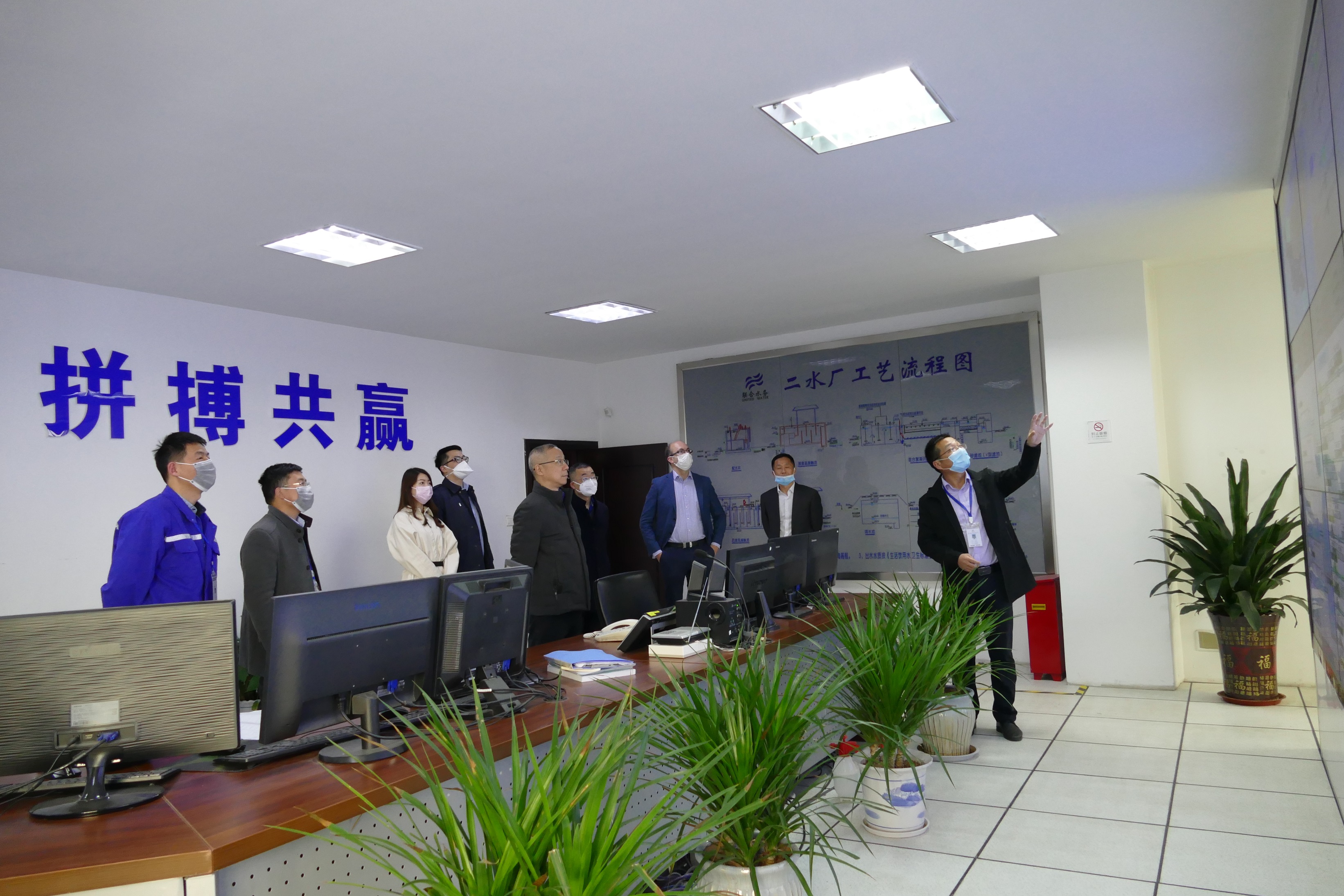 冬已去,春歸來。一方熱土,一份情懷。 3月30日下午,聯(lián)合水務(wù)集團(tuán)董事長兼總裁俞偉景先生率集團(tuán)高級副總裁劉猛先生、陳樵先生、JamesBeeson先生和羅斌副總裁蒞臨宿遷項(xiàng)目公司視察指導(dǎo)工作,隨行的還有總裁助理兼財(cái)務(wù)總經(jīng)理陳國清先生、證券事務(wù)部總經(jīng)理許行志先生。宿遷項(xiàng)目公司總經(jīng)理曾真全程陪同視察。 不顧舟車勞頓,俞總裁一行首先來到在建的第二水廠四期擴(kuò)建工程現(xiàn)場。集團(tuán)建設(shè)管理部副總經(jīng)理葉峰向俞總一行介紹項(xiàng)目概況及進(jìn)展情況。第二水廠四期擴(kuò)建項(xiàng)目是在母公司聯(lián)合水務(wù)集團(tuán)大力支持下,宿遷公司為適應(yīng)宿遷市經(jīng)濟(jì)社會的快速發(fā)展,未雨綢繆建設(shè)的工程,是宿遷市重點(diǎn)民生工程。該工程占地約39.37畝,建設(shè)規(guī)模15萬噸/日,建設(shè)采用網(wǎng)格絮凝+平流沉淀池與清水池疊合工藝,使水處理構(gòu)筑物結(jié)構(gòu)更緊湊, 提升了土地使用率,凈水工藝采用先進(jìn)的“臭氧+活性炭”的深度處理方式。該工程于2019年9月開工建設(shè),今年7月高峰供水來臨前投入運(yùn)行,屆時,宿遷項(xiàng)目公司的供水能力將達(dá)43萬噸/日,極大滿足城市發(fā)展供水需求。疫情給工程建設(shè)造成了一定的阻擾,但項(xiàng)目部在積極響應(yīng)政府各項(xiàng)防控疫情政策前提下,千方百計(jì)克服困難,保證工程建設(shè)進(jìn)度,目前各項(xiàng)施工及設(shè)備采購、安裝已逐漸步入正軌。俞總裁對四期擴(kuò)建項(xiàng)目的設(shè)計(jì)規(guī)劃、土建施工、建設(shè)管理等給予了充分肯定,并提出了繼續(xù)努力,按期保質(zhì)保量完成項(xiàng)目建設(shè),為宿遷百姓安全供水做好保障的殷切期望。 圖1:俞總裁一行視察二水廠四期擴(kuò)建項(xiàng)目 自緊張有序施工的四期項(xiàng)目工地移步二水廠,春意更濃,繁花似錦,海棠、桃花爭相斗艷,紅葉石楠紛紛著上紅裝,爭寵春天。走在綠樹林立、鳥語花香的生產(chǎn)廠區(qū),俞總裁一行贊不絕口,干凈整潔、優(yōu)雅怡人的生產(chǎn)環(huán)境,即體現(xiàn)了我們聯(lián)合水務(wù)生態(tài)為先、綠色生產(chǎn)的發(fā)展理念,也充分彰顯了公司為員工創(chuàng)造優(yōu)質(zhì)工作環(huán)境的人文關(guān)懷。經(jīng)過一期配水井、斜管沉淀池拾階而上,來到深度處理碳濾池,清波蕩漾,公司生產(chǎn)副總經(jīng)理趙軍向俞總裁一行介紹了嚴(yán)格的制水工藝流程,特別是深度處理工藝對宿遷市供水水質(zhì)不斷提升的重要性。由深度處理碳濾池拾階而下,便來到了直飲水處,從命名足可見水質(zhì)優(yōu)秀的程度,出廠水達(dá)到可以直接飲用的標(biāo)準(zhǔn),在全江蘇省也是位居前列。大家紛紛駐足,品嘗稱贊。沿著兩側(cè)春花爛漫的廠區(qū)道路,又到水質(zhì)檢測中心。嶄新的水檢大樓位于廠區(qū)偏南一角,環(huán)境清幽,正是潛心于水質(zhì)檢測研究的好所在。俞總裁一行饒有興致地進(jìn)行了參觀。水檢公司經(jīng)理葉慎忠詳細(xì)介紹了各個化驗(yàn)室及儀器設(shè)備的功用,俞總裁認(rèn)真傾聽,對檢測項(xiàng)目、檢測頻率等表示了關(guān)注,對宿遷項(xiàng)目的水質(zhì)檢測能力非常認(rèn)可,他說,宿遷市飲用水百姓滿意度連續(xù)兩年全省第二,今年是88.8%,與第一名的蘇州市僅差1.8個百分點(diǎn),這與水檢人員的認(rèn)真負(fù)責(zé)、嚴(yán)把水質(zhì)關(guān)是密不可分的,勉勵大家繼續(xù)努力,勇爭第一,同時不斷拓展對外業(yè)務(wù),為宿遷百姓輸送更優(yōu)質(zhì)的自來水。 圖2:俞總裁一行視察水質(zhì)檢測中心 自水檢大樓走出,穿過生產(chǎn)區(qū),途中俞總裁不時關(guān)心生產(chǎn)人員配置、輪班制度、廠區(qū)標(biāo)識標(biāo)記定期更新等細(xì)節(jié)。最后,俞總裁一行來到位于辦公區(qū)的供水調(diào)度中心,液晶大屏上生產(chǎn)過程中濁度、PH值等工藝參數(shù)、各供水區(qū)域水壓、各二次供水泵房實(shí)時運(yùn)行情況以及供水管網(wǎng)GIS系統(tǒng)等一覽無余,信息量非常強(qiáng)大。俞總裁一行在大屏前認(rèn)真觀看,工作人員對他們提出的問題進(jìn)行了現(xiàn)場演練,宿遷公司的科學(xué)供水調(diào)度和公司向智慧化水企邁進(jìn)的步伐得到了一致肯定,俞總裁倍感欣慰,叮囑大家一定要不斷進(jìn)取,從源頭到水龍頭,為宿遷百姓提供最優(yōu)質(zhì)的供水服務(wù)。宿遷公司總經(jīng)理曾真代表全體員工對俞總裁的關(guān)懷與激勵表示由衷的感謝,并表態(tài),宿遷項(xiàng)目全體員工將永遠(yuǎn)秉持聯(lián)合水務(wù)發(fā)展理念,供優(yōu)質(zhì)之水,服誠信之務(wù)! 圖3:俞總裁一行視察供水調(diào)度中心 “一定要為宿遷百姓做好供水服務(wù)”,俞總裁此行多次提及,從宿遷這方熱土,聯(lián)合水務(wù)開啟了水務(wù)行業(yè)的征程,一種勝似對故土的眷戀與關(guān)心之情,言不由衷。帶著這種大愛的情懷,奮發(fā)進(jìn)取,聯(lián)合水務(wù)致力于“成為一家偉大的水務(wù)公司”的愿景一定能早日實(shí)現(xiàn)!