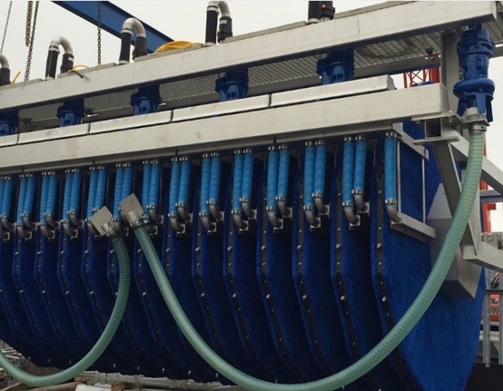 當(dāng)濾池內(nèi)水位達(dá)到與濾液水位相差25 cm的水位時(shí),開始進(jìn)行濾池清洗。在較低的過濾器負(fù)荷,過濾器清洗將啟動(dòng)時(shí)間控制(一般每2小時(shí))。圓盤過濾器緩慢旋轉(zhuǎn)(1 - 2轉(zhuǎn)/分鐘),固體通過吸力裝置移除。