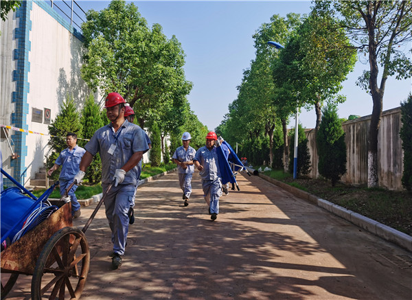 8月27日上午9時許,應急演練正式開始。因生產(chǎn)部運行工在有限空間的1#加藥間加藥池內(nèi)清理藥劑殘留物時違章操作,導致中毒昏倒,隨行操作人員發(fā)現(xiàn)后初步判斷,有限空間作業(yè)區(qū)域內(nèi)可能存在有毒有害氣體導致運行工重度昏迷,不敢貿(mào)然進入,立即向公司安全生產(chǎn)總指揮匯報情況。