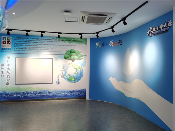 為與時俱進,更好地展示水知識,宣揚珍愛水資源的理念,公司出資對水文化展示館進行了重裝升級。重裝主要是在保持原有三大展區(qū)布局的基礎(chǔ)上,對整個水展館的“聲、光、電、影”等多媒體儀器設(shè)備進行全面更新?lián)Q代,并對每個展區(qū)的細節(jié)進行升級改造。如在論水展區(qū),對城市供水發(fā)展進行了最新智慧水務(wù)建設(shè)的呈現(xiàn),對水脈里程資料進行了新舊更迭;在治水展區(qū),對更加先進的工藝流程進行添加,對新舊供水設(shè)施、設(shè)備進行展示對比;在節(jié)水展區(qū),對水務(wù)行業(yè)數(shù)據(jù)進行更新,發(fā)出了具有新時代意義的節(jié)水倡議書,對原來靜態(tài)的水瓶墻賦予了生機活力,改造成為了中小學(xué)生參觀的感悟圖畫墻。