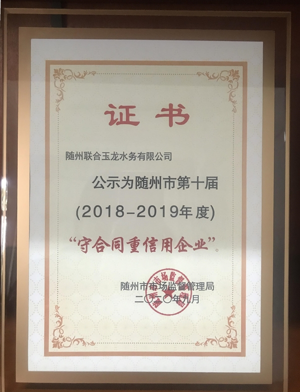 隨州聯合玉龍扎根隨州十三年來,企業(yè)品牌和商譽為公眾廣為知曉,具有廣泛社會影響力,在“守合同、重信用”方面一直表現優(yōu)良。2020年5月,隨州聯合玉龍水務有限公司在得知隨州市第十屆暨湖北省第15屆“守合同重信用企業(yè)”公示活動的通知后,積極申報。經過四個多月的初審、核查、抽查、公示等評審流程,我司各項環(huán)節(jié)均符合要求,隨州市市場監(jiān)督管理局于2020年10月正式對我司頒發(fā)《隨州市第十屆(2018-2019年度)“守合同重信用企業(yè)”》榮譽證書。