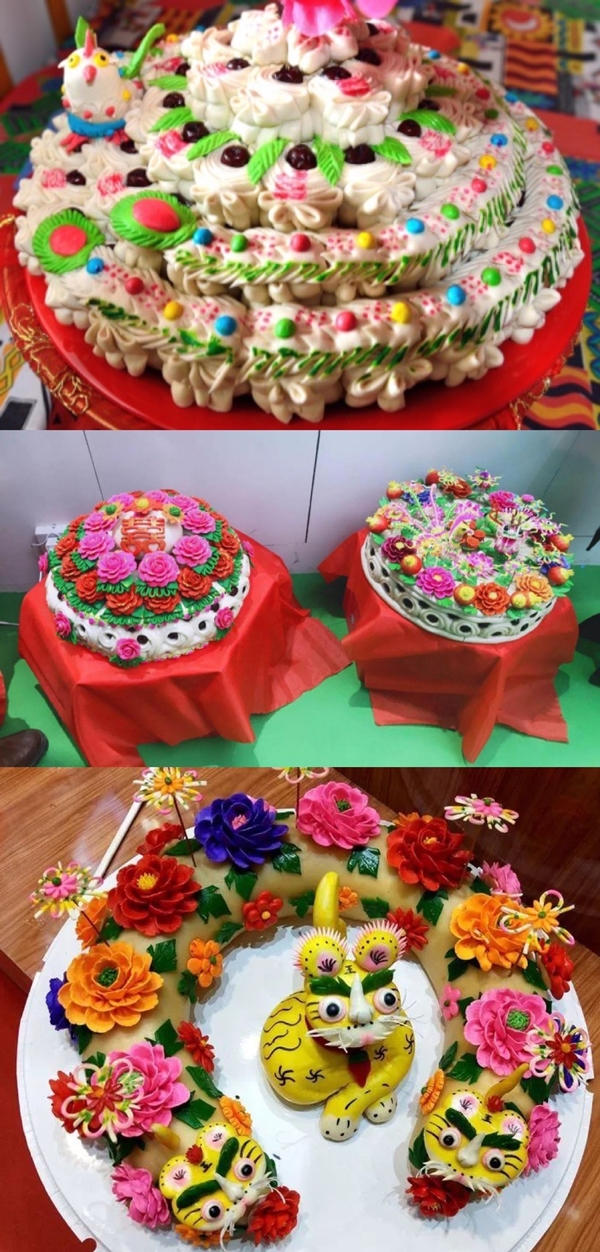 古絳州,今天的新絳縣,一直是山西省重要的小麥、棉花產(chǎn)地。麥收時節(jié),家家戶戶收麥、晾曬,用上等的小麥磨成面粉。每逢年歲時節(jié)、絳州民間面塑形態(tài)各異、花色絢麗,又被當?shù)厝朔Q為“花饃”。因民俗而出現(xiàn)的面塑則代代相傳、生生不息,經(jīng)過幾千年的傳承和經(jīng)營,成為中國傳統(tǒng)文化和民間藝術的一部分。春節(jié),講究“大門獅子二門狗”,寓意鎮(zhèn)宅保平安;水缸旁放“雙頭魚”,寓意連年有余;糧倉放牛拉車和麥囤,寓意糧倉滿溢、日子越過越景氣;天地爺處祭棗山花饃、豬羊饃、節(jié)節(jié)高饃,寓意殺豬宰羊、生活一年比一年好;財神爺處祭元寶棗籃饃,寓意招財進寶。清明時節(jié),要捏豬頭饃、刺魚饃等祭祖掃墓,刺饃還得在墳頭滾一滾,意為已故祖先撓癢癢,盡兒孫之孝。端午節(jié),要捏老虎饃,“虎鎮(zhèn)五毒”,寓意去災辟邪;槎Y上,要捏龍鳳糕,插柏葉,紅繩系核桃、紅棗、花生、石榴、寓意夫妻百年好合、發(fā)家致富、生兒育女。新生兒滿月時,要蒸各式各樣的花、果造型的花饃、寓意開花結(jié)果。壽誕時、兒女要為長輩蒸壽桃饃。為母親拜壽時,插一組“七仙女拜壽”,為父親拜壽時,插一組“八仙慶壽”,顯示兒女孝心。在這片土地上,自漢代以來流傳千年的捏花饃風俗,早已深深融入絳州人們生活的方方面面。只要有誰家遇上紅白事,鄰居、親戚都會聚集在一起幫忙蒸制花饃。