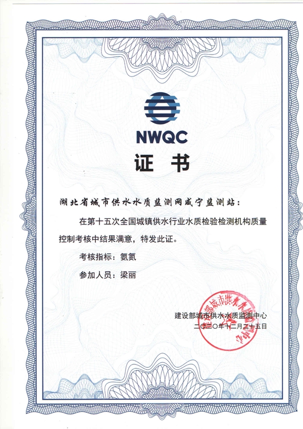 為加強城鎮(zhèn)供水水質(zhì)檢驗檢測機構(gòu)的質(zhì)量控制,促進檢測能力和管理水平提升,住建部城市供水水質(zhì)監(jiān)測中心于2020年組織開展《第15次全國城鎮(zhèn)供水行業(yè)檢驗檢測機構(gòu)生活飲用水氨氮項目的質(zhì)量控制考核》,香泉水檢公司暨湖北省城市供水水質(zhì)監(jiān)測網(wǎng)咸寧監(jiān)測站報名參加了本次能力驗證活動。2020年9月2日,公司順利完成了氨氮能力驗證考核樣品檢測。近日,公司接到了住建部頒發(fā)的能力驗證結(jié)果通知書,順利通過本次水中氨氮項目的能力驗證,取得了“滿意”結(jié)果。