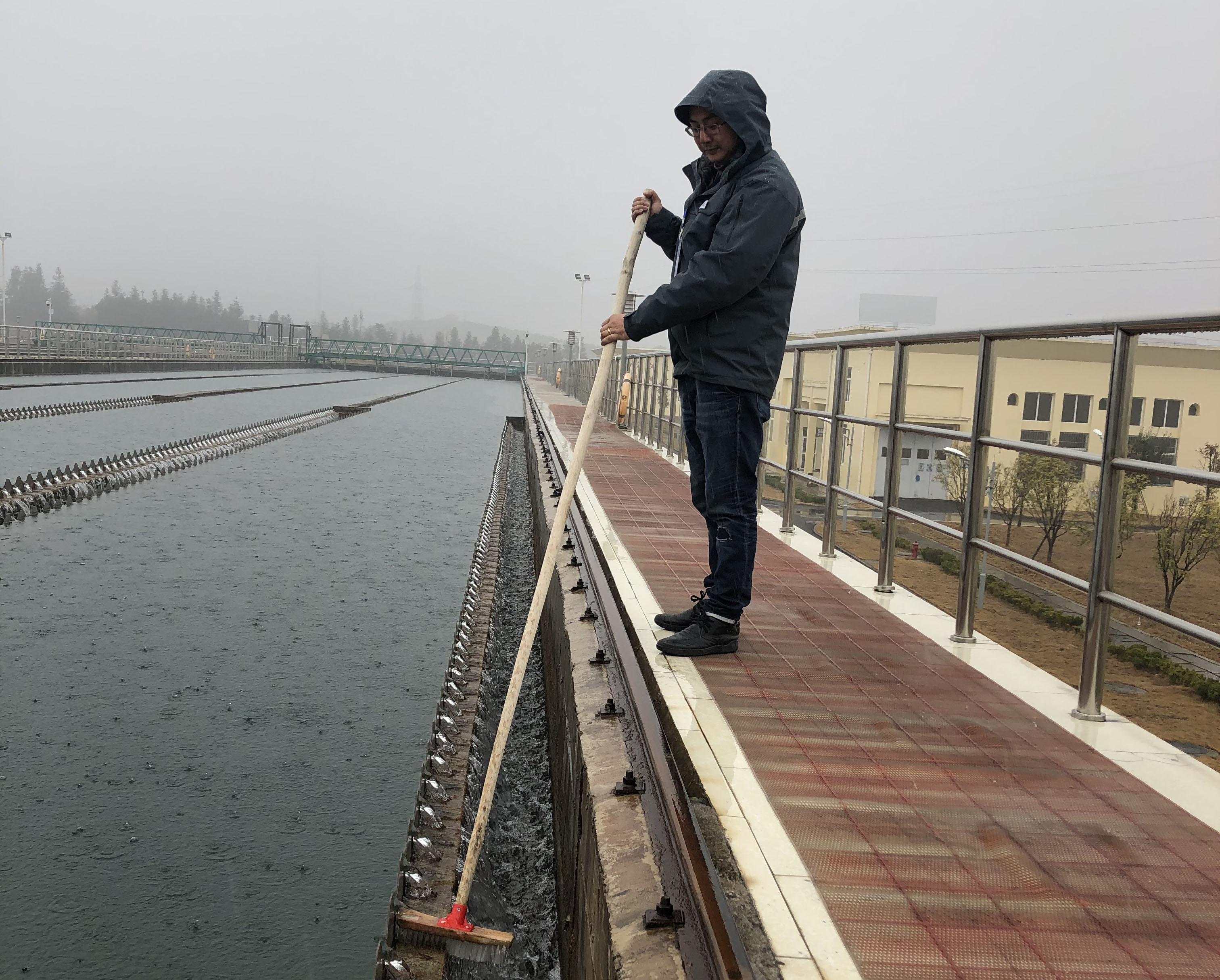 黃智淵正在檢查機(jī)電設(shè)備 在王英水廠的平流沉淀池上,陳鋒冒著大雨正在進(jìn)行清理工作。新年第一天,天公不作美,下起了磅礴大雨,但是為了保障佳節(jié)期間供水生產(chǎn)無患,咸寧聯(lián)合水務(wù)制水部的一線員工們放棄了在家過節(jié)的機(jī)會,冒雨堅(jiān)守在制水生產(chǎn)線上,時(shí)刻保障城市供水無礙。