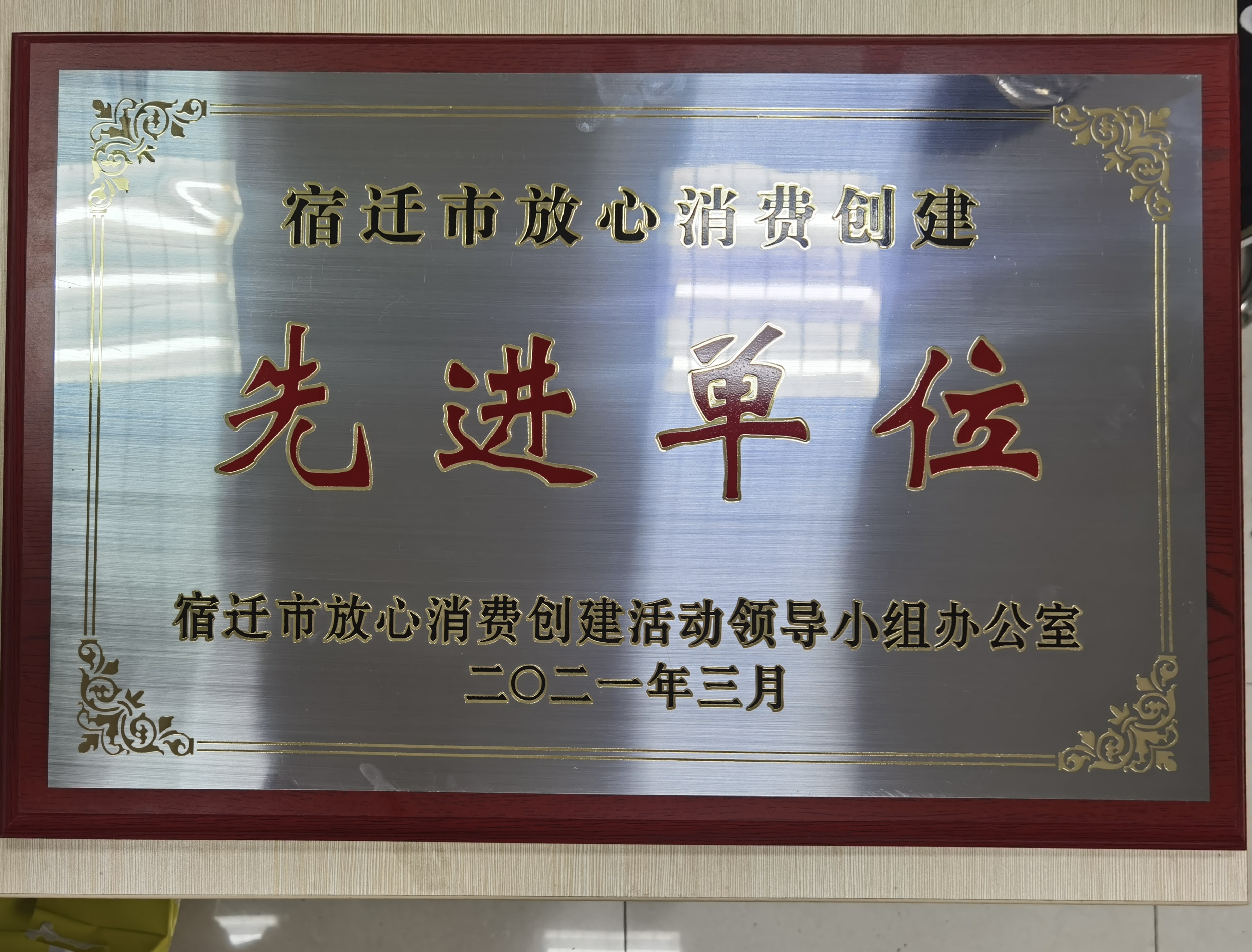 圖:“宿遷市放心消費創(chuàng)建先進(jìn)單位”獲獎證書