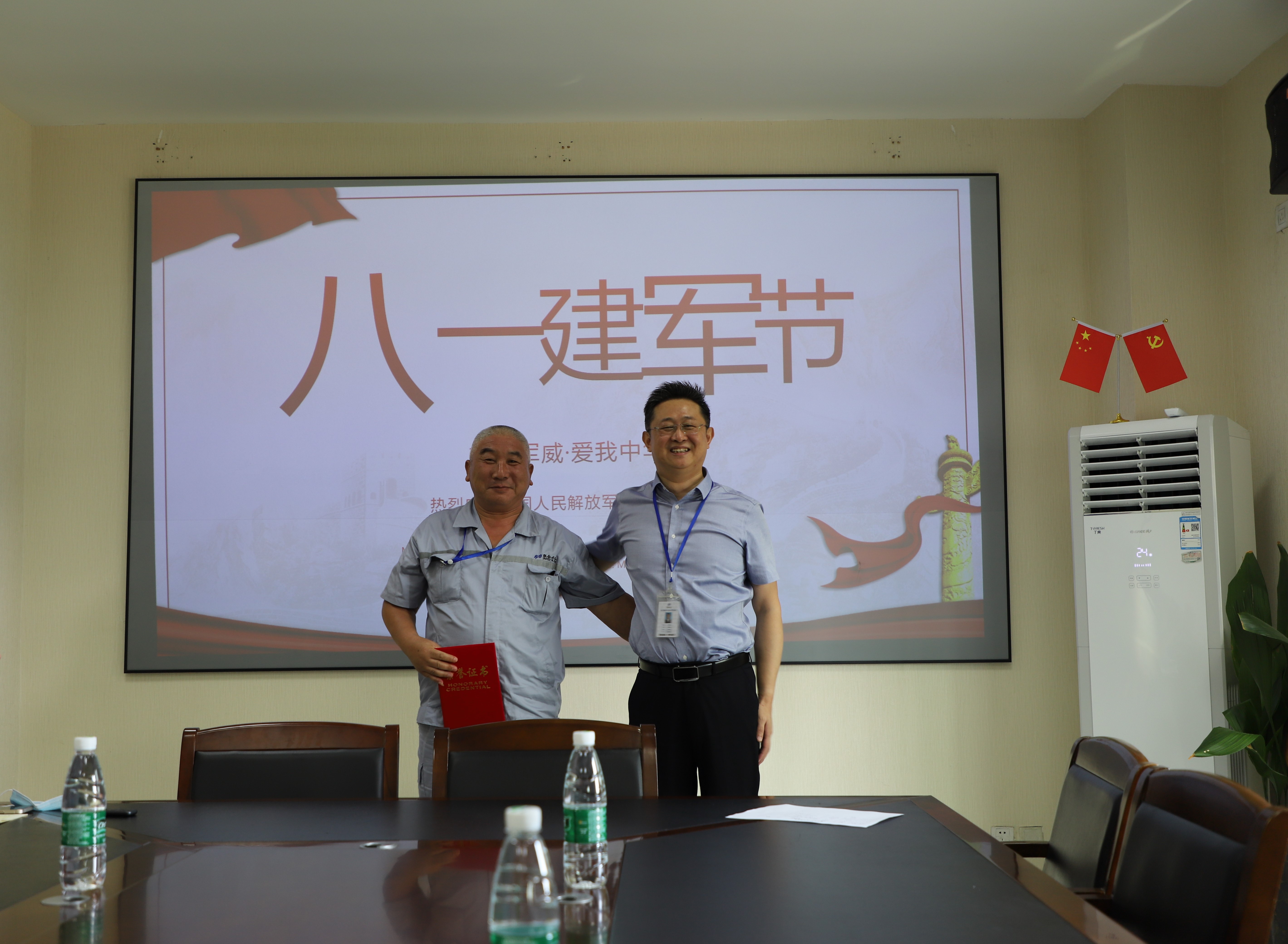 為慶祝即將到來的“八一建軍節(jié)”,江蘇聯(lián)合水務(wù)科技股份有限公司宿遷公司組織退伍在職員工開展慶!鞍艘唤ㄜ姽(jié)”活動。退伍不褪色,換裝不換心,曾經(jīng),錚錚鐵骨戰(zhàn)沙場,保家衛(wèi)國,而今,盡心竭力保供水,守衛(wèi)家園生命線。在這特殊的節(jié)日,向公司四十三名退伍軍人在職員工致敬!向全國光榮的軍人致敬! 7月30日上午,在公司二水廠二樓會議室,退伍軍人員工代表近20人集聚一堂。首先,也曾經(jīng)一身戎裝的公司客服運營副總經(jīng)理尹邦交,代表公司為評選出的五位“最美退役軍人”——周允勝、孟慶葉、韓江、臧十偉、馬強頒發(fā)了榮譽證書,對他們不忘軍人本色,繼續(xù)發(fā)揚軍人不怕苦、不怕累的精神,在平凡的供水崗位上忘我奉獻的高尚品質(zhì)給予了充分肯定。