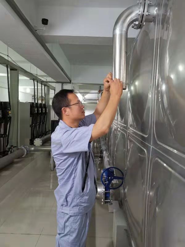 圖:檢查泵房水箱 多措并舉調(diào)配,穩(wěn)定居民供水。當(dāng)前,聯(lián)合水務(wù)宿遷公司采用的二次供水方式有兩種,分別是管網(wǎng)疊壓的無負(fù)壓供水、低位水箱加變頻調(diào)速供水。根據(jù)小區(qū)建筑設(shè)計,因地制宜采用相匹配的供水方式,既節(jié)省能源又持續(xù)穩(wěn)定保障供水。通過多種方式并用,加強巡檢,降低設(shè)備故障率,保障了恒壓供水,獲得用戶一致好評。