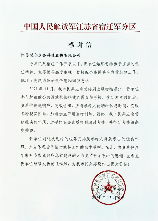 近日,江蘇省宿遷軍分區(qū)開展民兵年度考核驗收工作,經(jīng)過一天的考核,江蘇聯(lián)合水務科技股份有限公司最終以扎實的作風、過硬的業(yè)務素質(zhì)順利通過省、市兩級驗收和考核。考核結束后,宿遷軍分區(qū)向公司發(fā)來感謝信,感謝聯(lián)合水務多年來對宿遷市民兵應急營建設的大力支持。