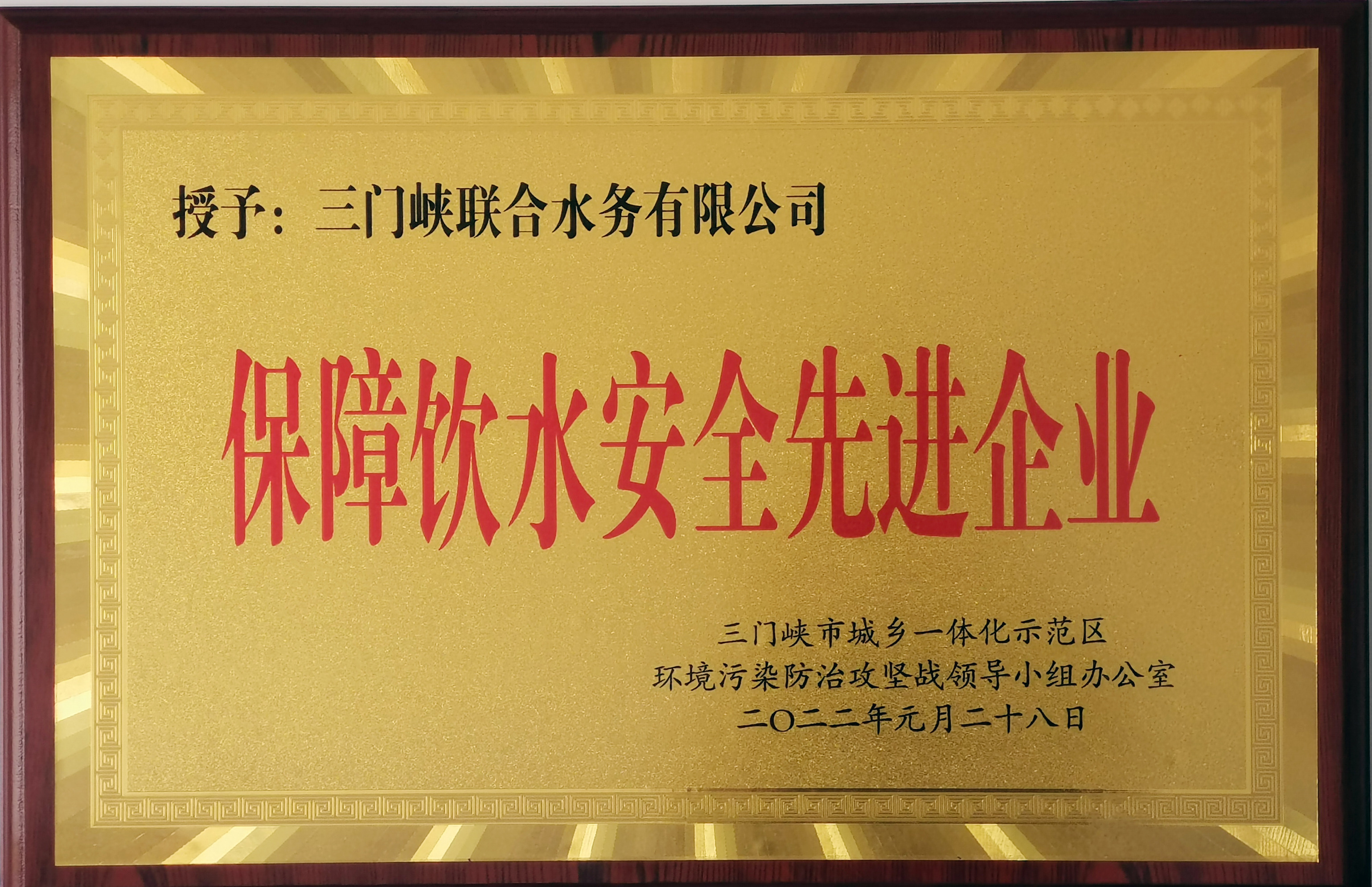 深耕細作篤前行,初心不改終有成。2月14日,一塊金燦燦的榮譽獎牌出現在三門峽聯合水務有限公司會議室。三門峽聯合水務有限公司2021年度在飲用水安全工作方面表現優(yōu)異,得到三門峽市城鄉(xiāng)一體化示范區(qū)環(huán)境污染防治攻堅戰(zhàn)領導小組辦公室的肯定,被授予“保障飲水安全先進企業(yè)”榮譽稱號。