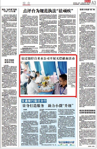 宿遷銀控自來(lái)水有限公司弘揚(yáng)水潤(rùn)萬(wàn)物的奉獻(xiàn)精神,多年來(lái),一直堅(jiān)持積極履行社會(huì)責(zé)任,每年均多次組織有意義的公益活動(dòng),“無(wú)償獻(xiàn)血”作為一項(xiàng)重要的公益事業(yè)已經(jīng)連續(xù)進(jìn)行6年,而且每當(dāng)血庫(kù)庫(kù)存告急之際我們都會(huì)及時(shí)伸出援助之手,為打造宿遷文明建設(shè)注入更多力量,也展現(xiàn)展現(xiàn)了我公司熱情、奉獻(xiàn)、和諧的良好企業(yè)形象。