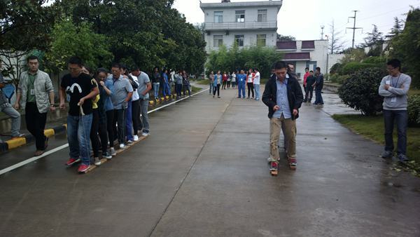 9月30日下午,舉辦的是“無軌列車”活動。該項團體活動要求每組4男4女搭配,各組組員的兩腳必須分站在由兩塊木板制成的行走板上,協(xié)調一致前行,在比賽過程中任意隊員任意部位與地面有接觸,即被警告1次,同時在總成績上增加10秒,警告3次取消比賽資格。賽道全長50米,含下坡路段,成績匯總后,以完成比賽用時最短的一組獲勝。最終,行政財務聯(lián)隊以1分48秒的成績獲得第一,工程聯(lián)隊獲得第二,洋河聯(lián)隊、污水客服聯(lián)隊并列第三。